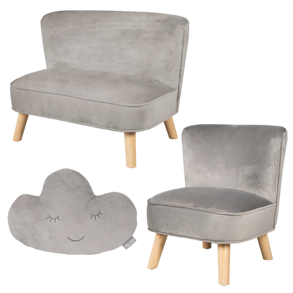 Divano e poltrona per bambini scandinavi + cuscino in velluto grigio