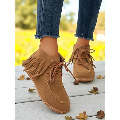 stivali mocassini in finta pelle scamosciata con frange da donna: stivaletti retrò con lacci per l'autunno, le avventure all'aria aperta e lo stile casual quotidiano