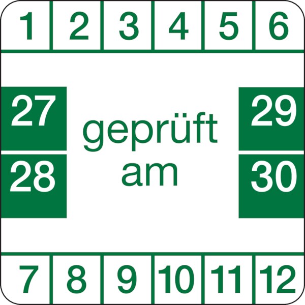 Prüfplakette ab 27, "geprüft am", grün/weiß - Bogen = 10 Plaketten - 30 x 30 mm Folie selbstklebend