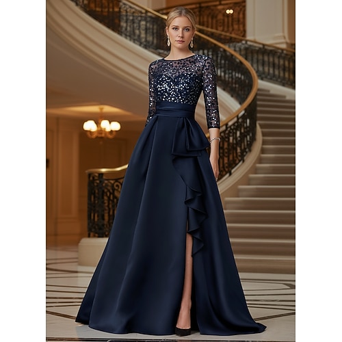 Linea ad A Lunghezza al pavimento Perline ricamate Abito Formale Abito da madre della sposa Abito da Sera Abito formale Elegante Scintillante Brillanti Manica 3/4 Scollo Illusione Matrimonio Formale