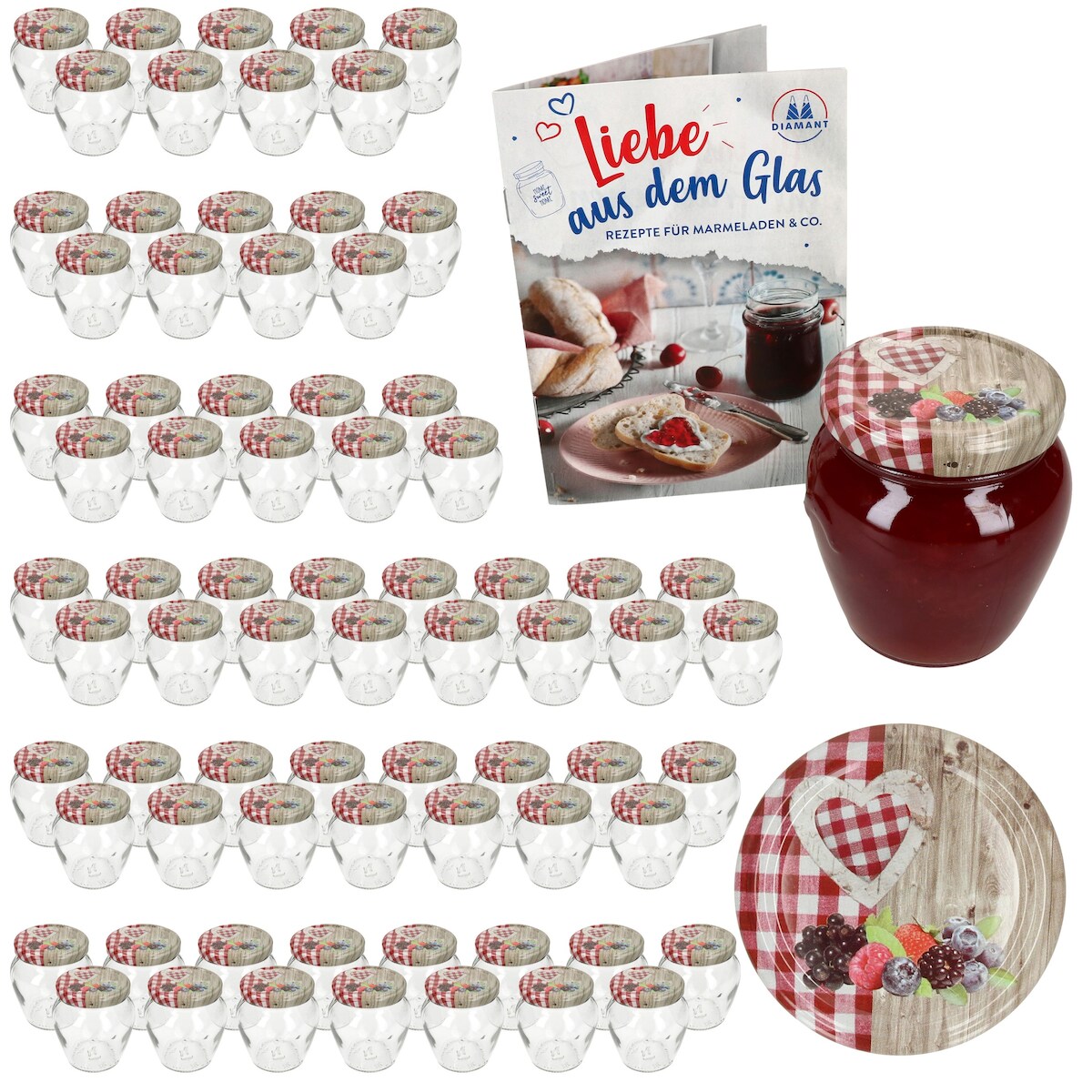 Mambocat 75er Set Marmeladengläser 212 ml Holz-Herz Rot Beeren Deckel TO 63 Einweckgläser