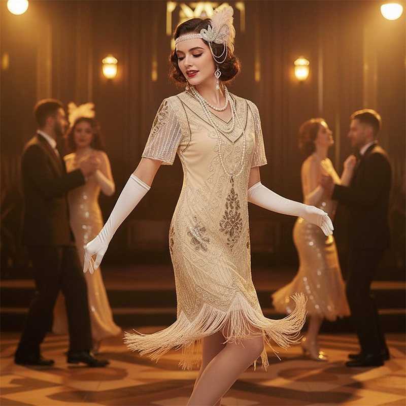 Roaring 20s Vintage Inspired The Great Gatsby Knee Length Flapper Dress Dress Outfits Short Sleeves The Great Gatsby Wedding Guest Sequins Tassel Fringe Sequin Tassel V Neck Fancy Dress Women's