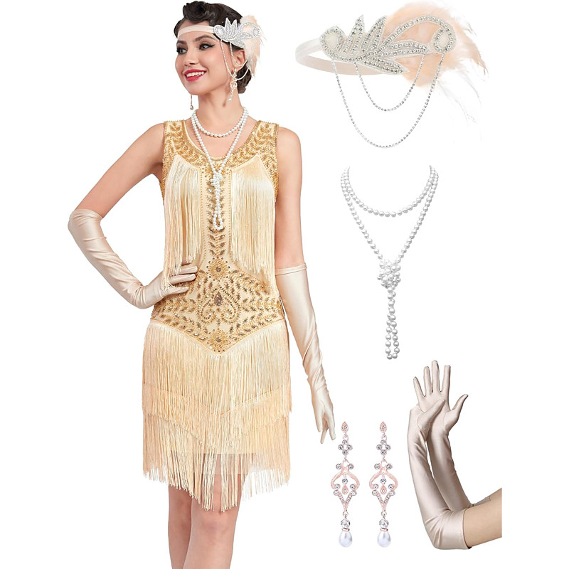 Set Roaring 20s Vintage Inspired The Great Gatsby Knee Length Short Length Flapper Dress Dress Outfits with Accessories Sleeveless The Great Gatsby Wedding Guest Sequins Tassel Fringe Sequin V Neck
