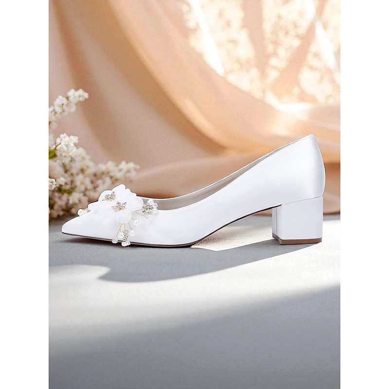 Elegant Satin Bridesmaid Shoes with Pearl Flower Detail – Comfortable Block Heel Wedding Shoes for Classic Romantic Ceremonies