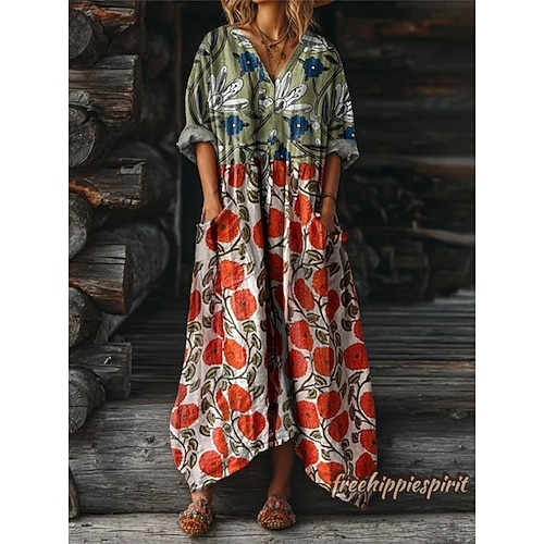 Per donna Abito Midi Vestito Estivo Abito a trapezio Vacanza Casual Boho Ferie Vestibilità regolare Floreale Grafico Blocco di colori Manica Lunga Scollo a V Blu Rosa Marrone Verde Estate Primavera