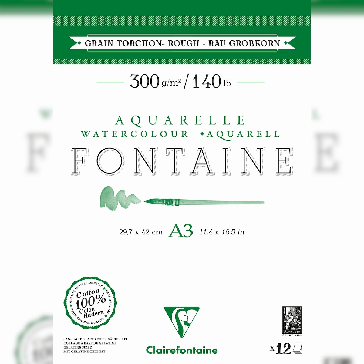 Clairefontaine 5x Fontaine, Aquarellblock 2-seitig geleimt, Torchon, A3, 12 Blatt 300g weiß - 975952C