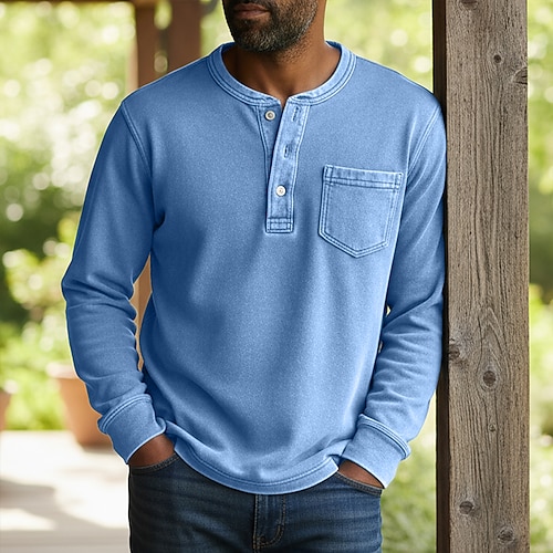 Per uomo Maglia Henley Camicia 100% cotone lavaggio acido Manica Lunga Henley Primavera Autunno Tutte le stagioni Tinta unica Vintage Retrò Vintage Casual Stile Vintage Lavato Casuale Blu chiaro Nero