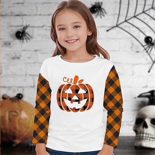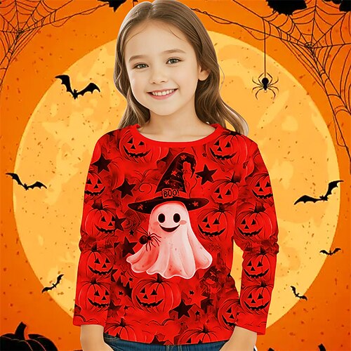 Halloween Mädchen 3D Kürbis Geist T-Shirt Langarm Frühling Herbst Mode Basic Kinder 4-12 Jahre Rundhalsausschnitt Outdoor Lässig Täglich Normale Passform