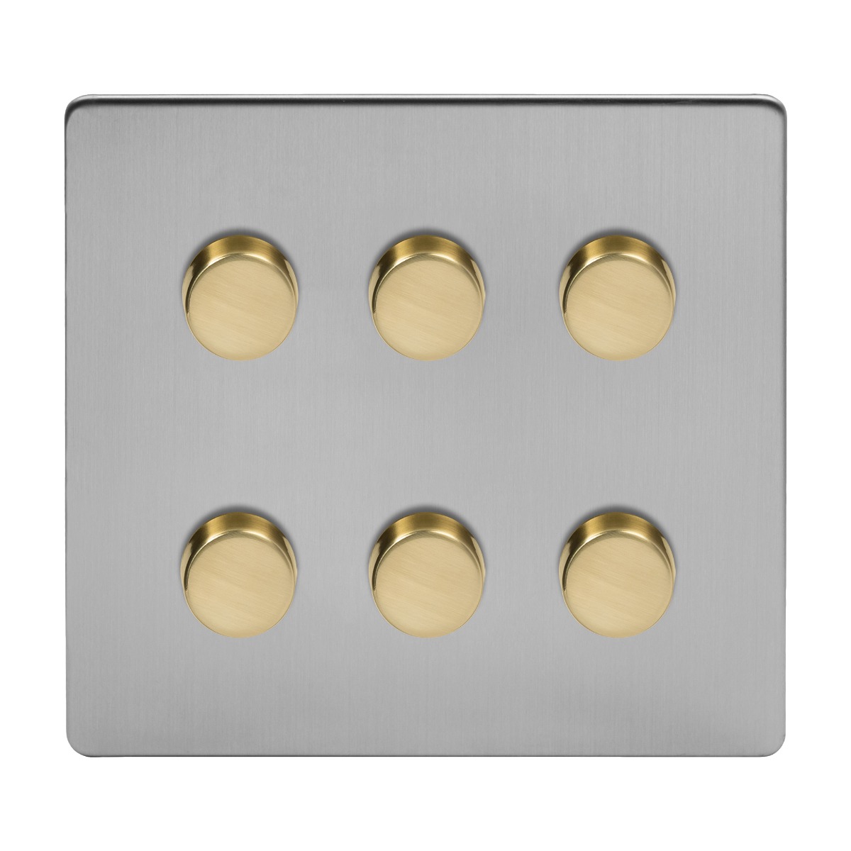 Soho Lighting Brushed Chrome & Brushed Brass Flat Plate 6 Gang 2 Way Intelligent Trailing Dimmer Switch Screwless 150W LED (400w Halogen/Incandescent)
