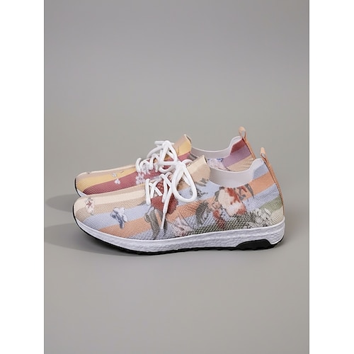 Sneakers da donna in maglia con stampa floreale gialla: scarpe casual leggere e traspiranti con suola antiscivolo ammortizzata, scarpe da passeggio alla moda per viaggi, attività all'aperto e per