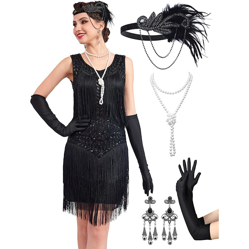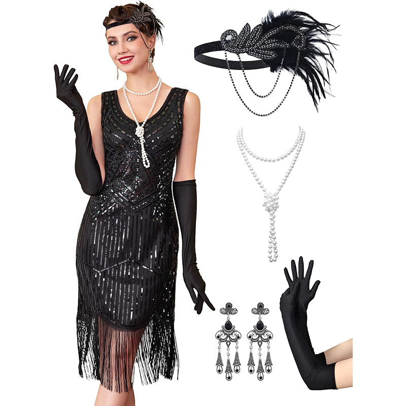 Set Roaring 20s 1920s Cocktail Dress Knee Length Flapper Dress Dress Outfits with Accessories Sleeveless The Great Gatsby Charleston Sequins Tassel Fringe Feather V Neck Fancy Dress Women's Carnival