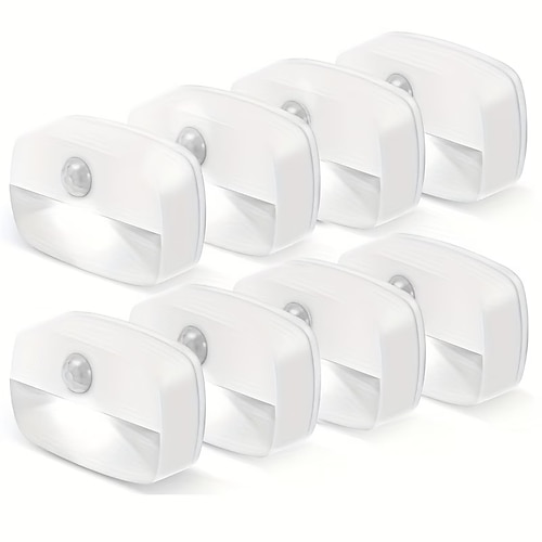 8 luci notturne a LED intelligenti con sensore di presenza, alimentate a batterie AAA, ideali per armadi, bagni, camere da letto, scale, guardaroba, corridoi e cucine.