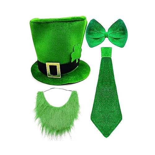 set di accessori per costume da folletto di San Patrizio da uomo, materiale in poliestere, cappello a cilindro verde con fibbia, barba finta, papillon e cravatta, feste e celebrazioni festive