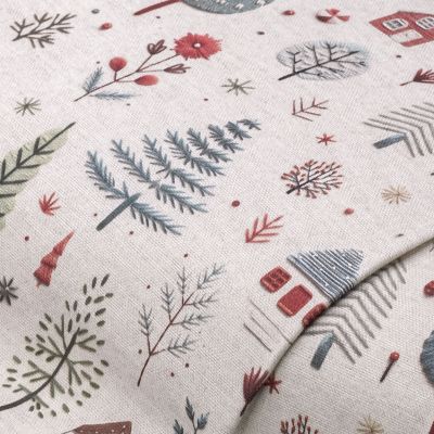 Tissu canvas de coton "maisons et sapins", écru naturel/coloré, série Doreen