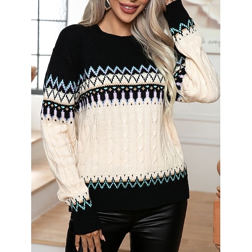 Damen Weihnachtspullover Fair Isle Pullover Pullover Fair Isle Sweater Lässig Weich Geometrisch Gerippt Rundhalsausschnitt Gestrickt Langarm Normale Oberteile Stricken Outdoor Täglich Wochenende