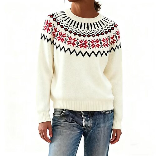 Per donna Maglione natalizio Fair Isle Felpa Maglione Moda Streetwear Casual Floreale Geometrico Girocollo Lavorato a maglia Stampato Manica Lunga Top Regolari Maglia Quotidiano Ferie Uscire Bianco