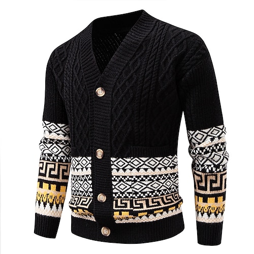 Men's Sweater Cardigan Sweater Fair Isle Sweater Ribbed Cable Knit Regular Tops Knitted Geometric V Neck Vacation Fashion Casual Daily Wear Clothing Apparel Fall Winter Black White M L XL