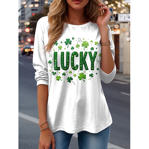 T-Shirt da donna per il giorno di San Patrizio Grafica Quadrifoglio Elegante Maniche Lunghe Girocollo Top Lunghi Quotidiani Uscita Fine Settimana Stampa Bianco Verde Primavera Autunno