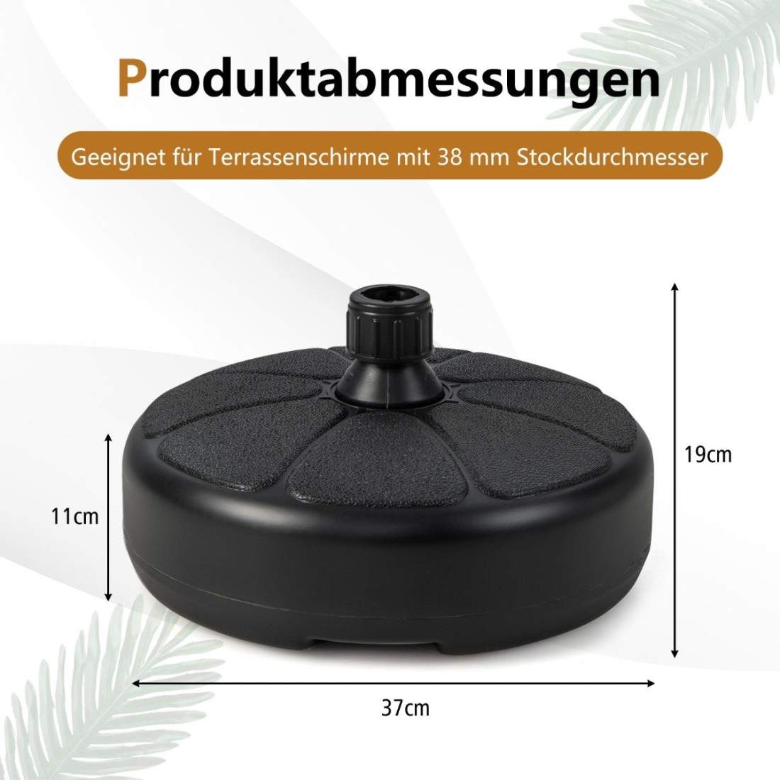 Täytettävä pyöreä sateenvarjoteline, jonka halkaisija on 37 cm, maksimissaan 12 kg mustaa