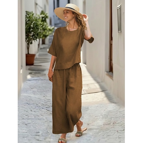 Per donna Set di biancheria in cotone Set di Pantaloni Mezza Manica Girocollo Semplice Arricciato Attivo Streetwear Quotidiano All'aperto Vacanza Nero Bianco Verde militare Estate Vestibilità comoda