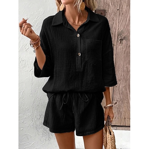 Per donna Set da due pezzi Camicia di cotone Set di Pantaloncini Manica Lunga Colletto a Camicia Semplice Moda Streetwear Casuale Quotidiano All'aperto Nero Bianco Blu marino Estate Vestibilit