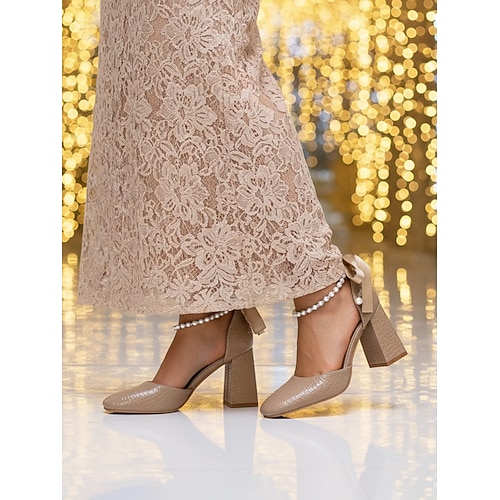 Aprikosenfarbene Damen-Pumps mit Blockabsatz und Perlen-Knöchelriemen – elegante, strukturierte Pumps für die Mutter der Braut bei schicken Stadthochzeiten