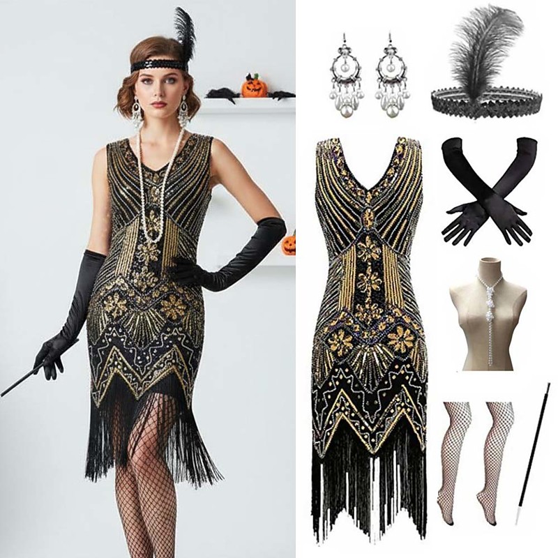 Set Roaring 20s 1920s Cocktail Dress Knee Length Flapper Dress Dress Outfits with Accessories Sleeveless The Great Gatsby Charleston Sequins Tassel Fringe Feather V Neck Fancy Dress Women's Carnival