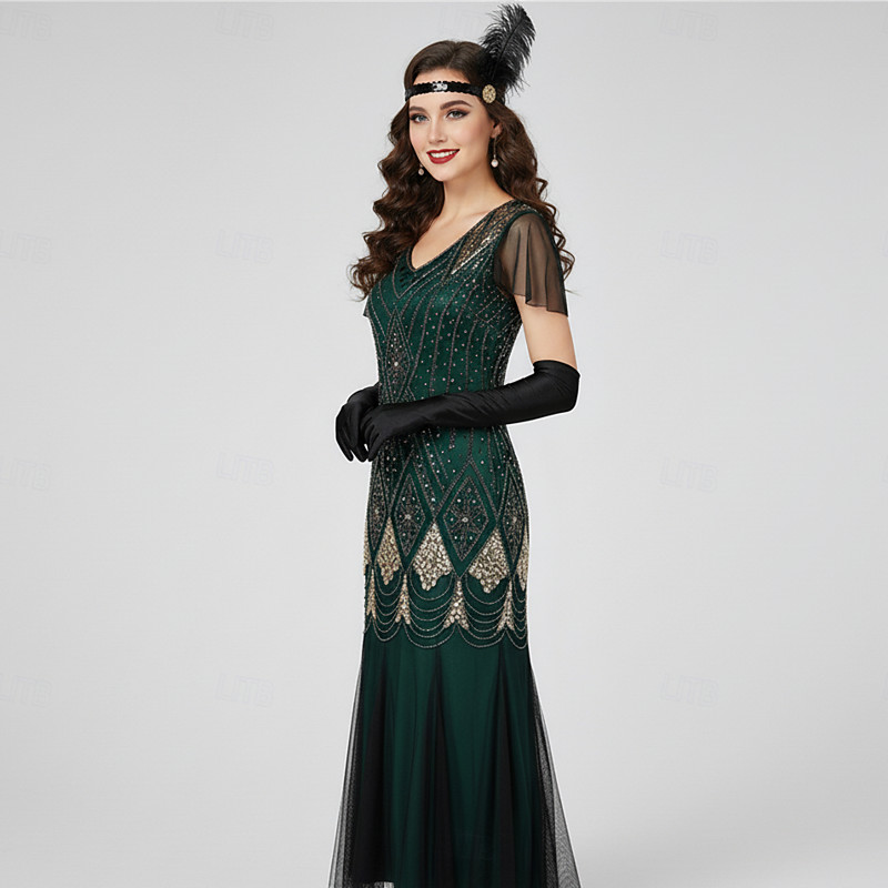 Set Roaring 20s 1920s Cocktail Dress Ankle Length Dress Outfits Prom Dress with Accessories Short Sleeves The Great Gatsby Plus Size Wedding Guest Tassel Fringe Tassel V Neck Fancy Dress Women's