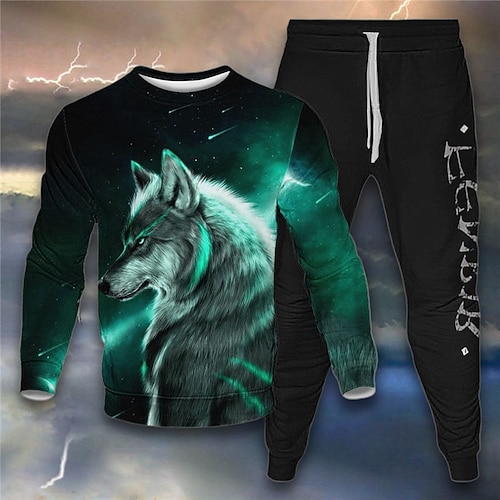 Per uomo Tuta Da Ginnastica Tuta da ginnastica Set di felpe Giallo Blu Viola Azzurro Grigio Girocollo Pop art Animali Lupo 2 pezzi Stampa Sportivo Informale Sport Stampa 3D Streetwear Abbigliamento