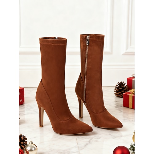 stivaletti da donna in pelle scamosciata rossa con punta a punta – eleganti stivaletti con tacco alto e cerniera per feste di Natale, occasioni speciali e moda invernale