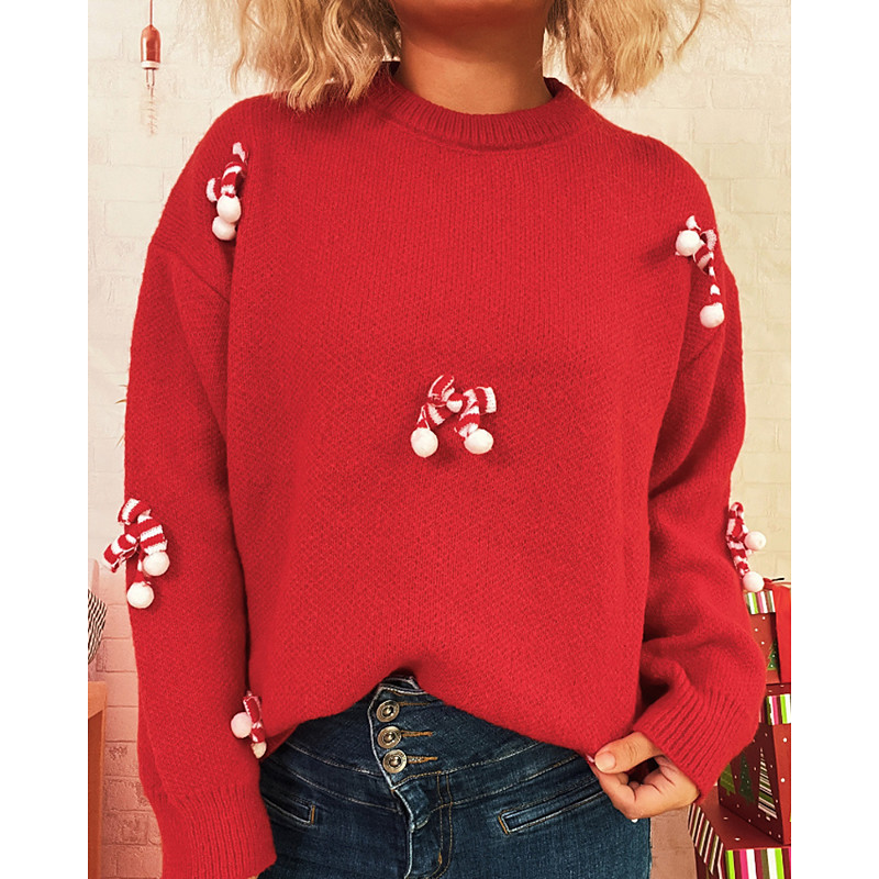Women's Sweater Pullover Pom Poms Ugly Christmas Gifts Streetwear Floral Crew Neck Knitted Long Sleeve Regular Tops Knit Christmas Outdoor Holiday Red Fall Winter