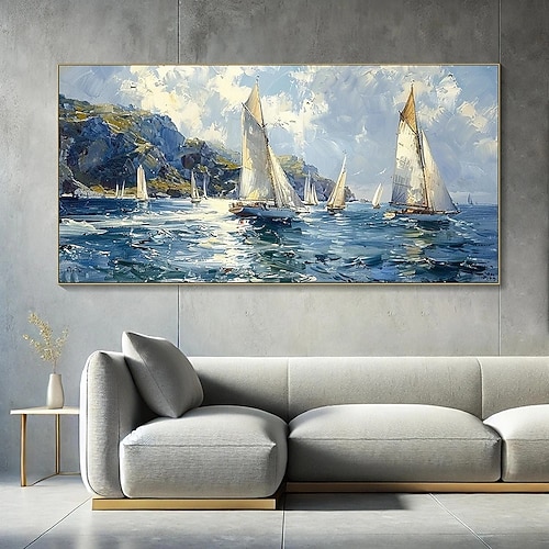 dipinto a olio fatto a mano su tela decorazione da parete moderna barca a vela sul mare blu paesaggio per soggiorno arredamento per la casa cornice tesa dipinto appeso / senza cornice