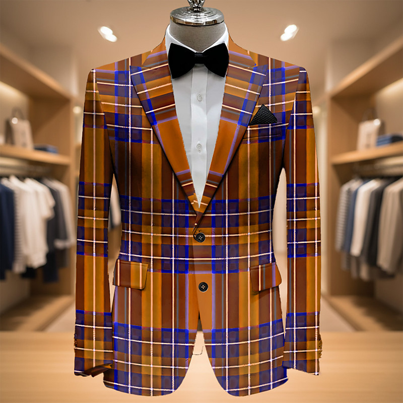 Men's Plaid Blazer Jacket Coat Fashion Comfortable Breathable Artistic Casual Daily Party Evening Wear Causal Pocket 3D Print Buttons All Seasons Notch Long Sleeve Red Brown