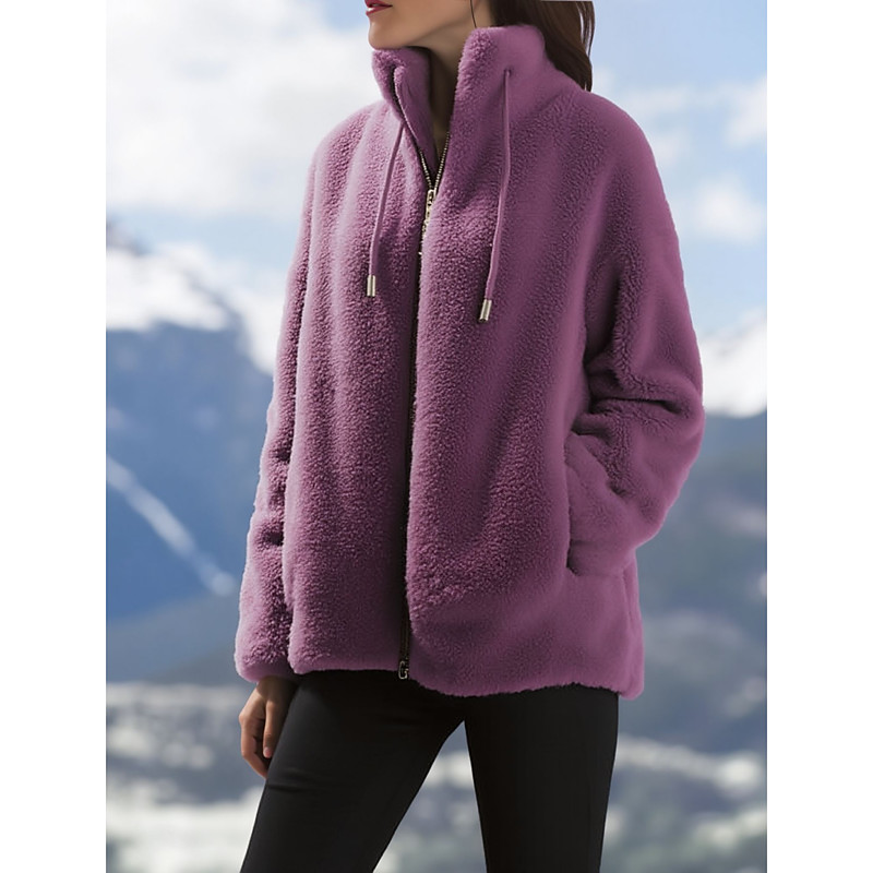 Women's Winter Coat Teddy Coat Warm Comfortable Drawstring Zipper Elegant Plush Casual Solid Color Home Casual Short Stand Collar Regular Fit Long Sleeve Outerwear Red Purple Green Spring Fall