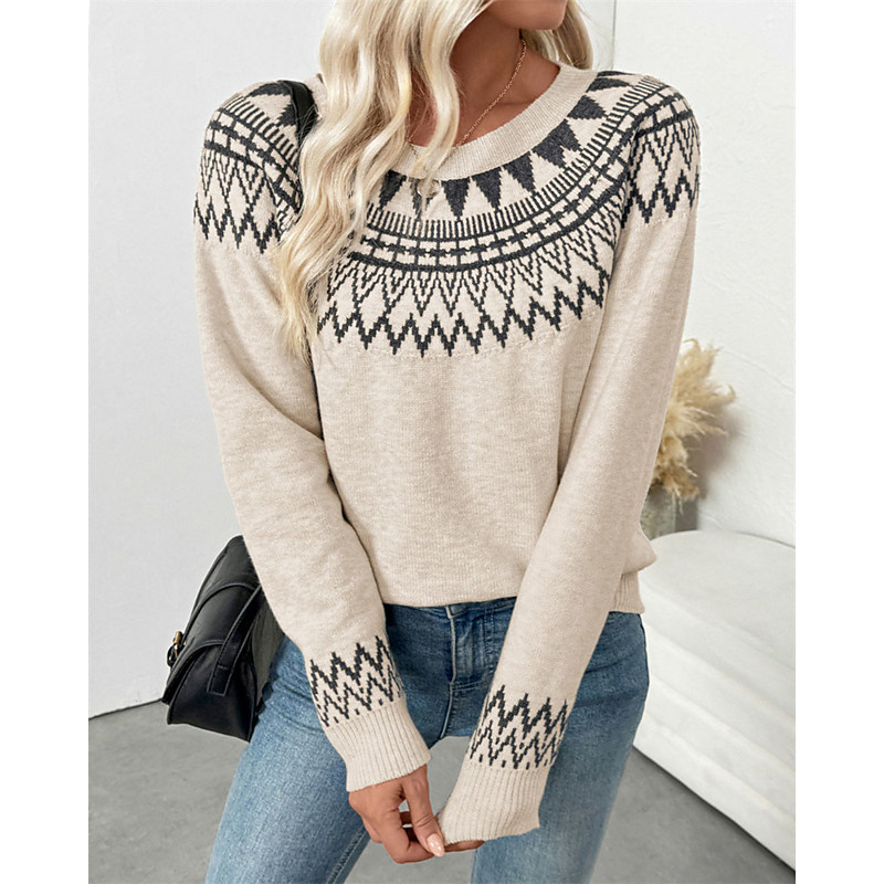Women's Christmas Sweater Fair Isle Sweater Sweater Pullover Elegant Vintage Fashion Solid Color Geometric Crew Neck Knitted Print Long Sleeve Regular Tops Knit Outdoor Daily Holiday Apricot Fall