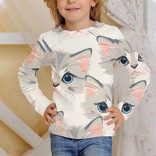 Mädchen 3D Tiermotiv Katze T-Shirt Langarm Frühling Herbst Mode Basic Kinder 4-12 Jahre Rundhalsausschnitt Outdoor Lässig Täglich Normale Passform