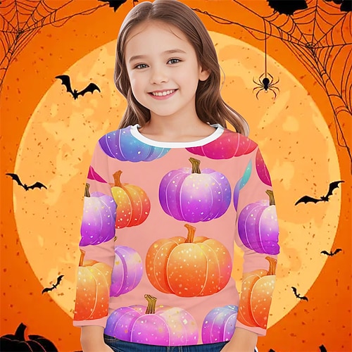 Halloween Mädchen 3D Kürbis T-Shirt Langarm Frühling Herbst Mode Basic Kinder 4-12 Jahre Rundhalsausschnitt Outdoor Lässig Täglich Normale Passform