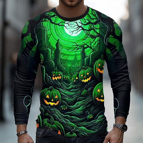 Halloween Herren Kürbis 3D T Shirt Langarm T-Shirt 3D-Druck Rundhalsausschnitt Hemd Mode Übertrieben Straße Lässig Täglich Orange Grün Sommer Frühling Herbst Bekleidung S M L XL XXL XXXL
