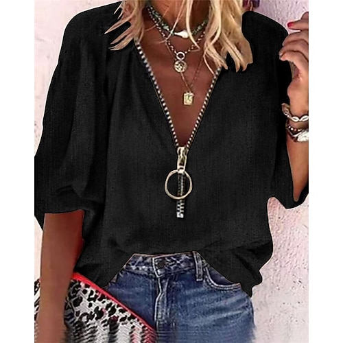 Per donna Blusa Top Eleganti Tinta unica Semplice Elegante Signore Essenziale Manica 3/4 Scollo a V Top Regolari Quotidiano Lavoro Uscire Arricciato Patchwork Cerniera Nero Cammello Estate Primavera