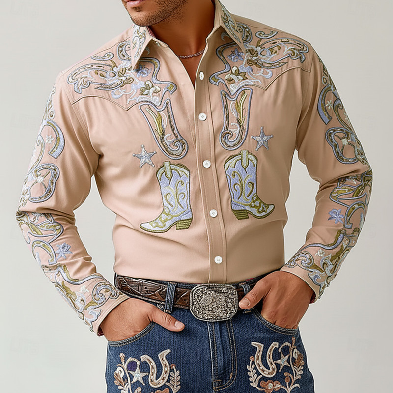 Men's Horseshoe Intricate Floral Shirt Western Shirt Cowboy Shirt Long Sleeve Vintage Retro Outdoor Vacation Spring Fall Turndown 3D Print Linen Like Shirt Light Pink Pink Blue