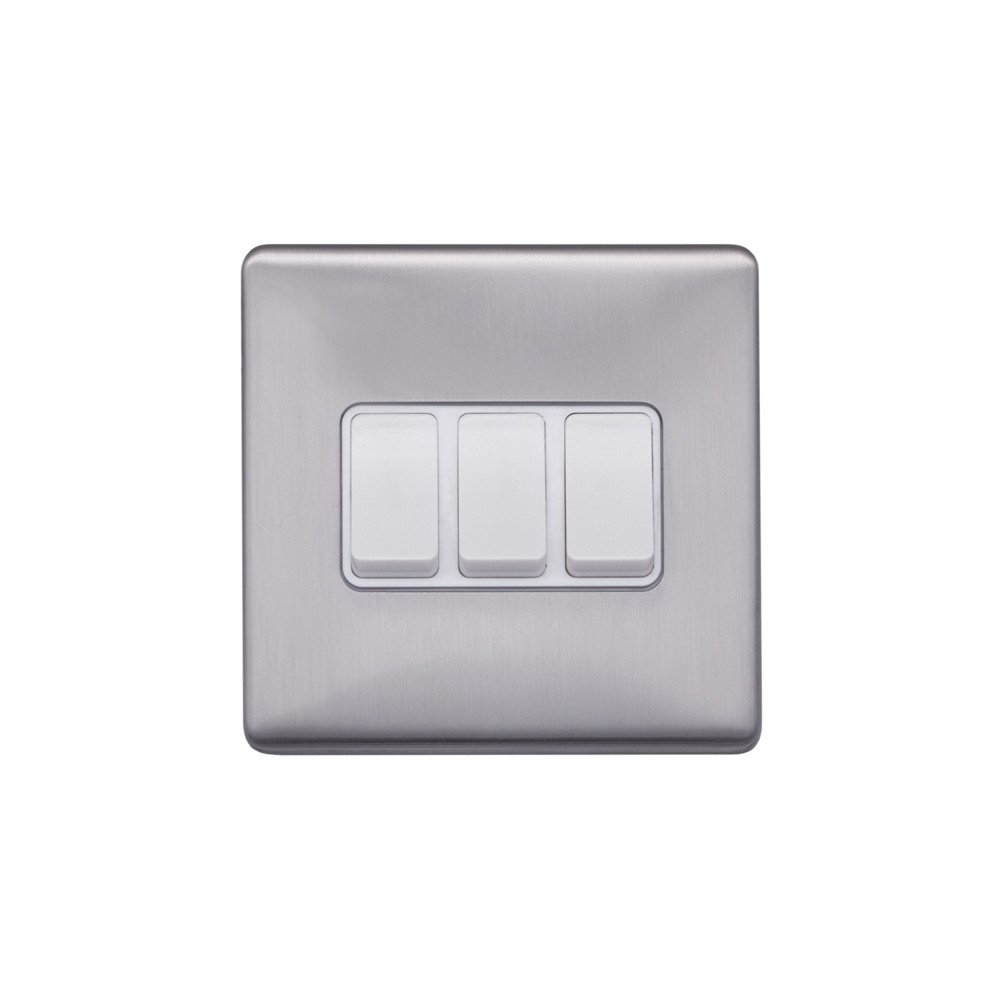 Lieber Brushed Chrome 10A 3 Gang 2 Way Switch - White Insert Screwless - Size: 86mm x 86mm x 2 mm
