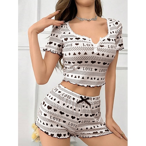Per donna Set Pigiama Casual Comfort Cuore Elastico in vita Shorts Quotidiano Casa Manica Corta Scollo a V Nero Rosso Estate Primavera Vestibilità aderente
