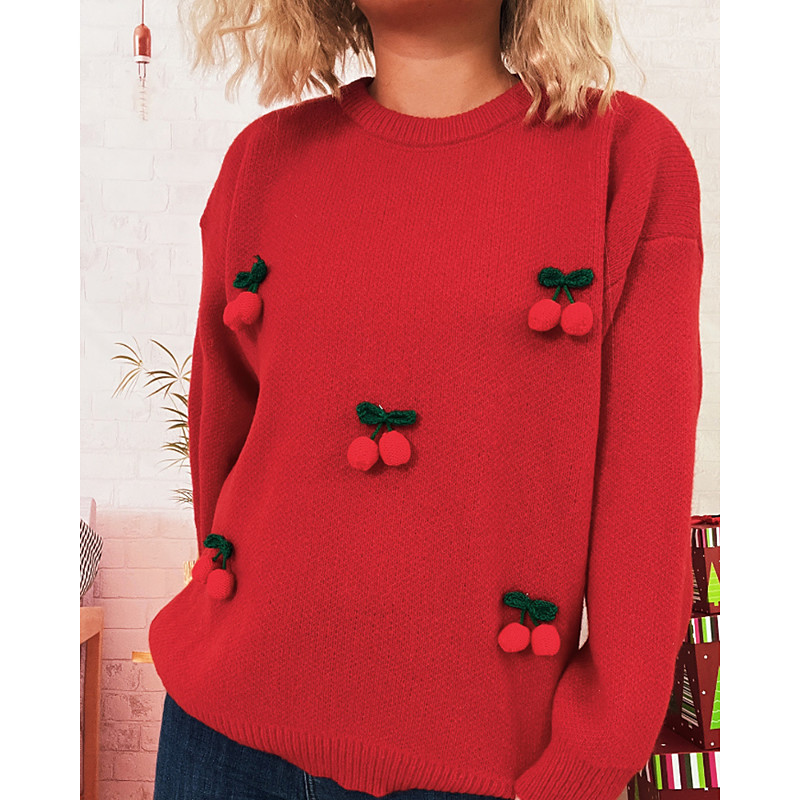 Women's Sweater Pullover Pom Poms Ugly Christmas Gifts Cute Fruit Ribbed Crew Neck Knitted Long Sleeve Regular Tops Knit Christmas Holiday Going out White Red Fall Winter