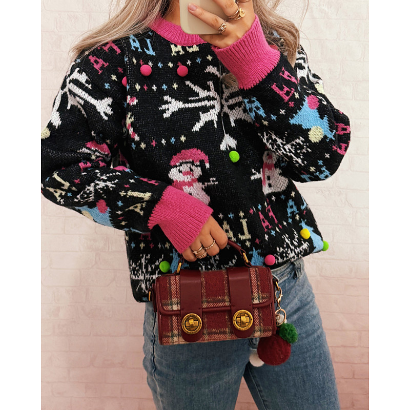 Women's Sweater Pullover Pom Poms Ugly Christmas Gifts Streetwear Floral Ribbed Crew Neck Knitted Long Sleeve Regular Tops Knit Christmas Outdoor Holiday Black Red Fall Winter