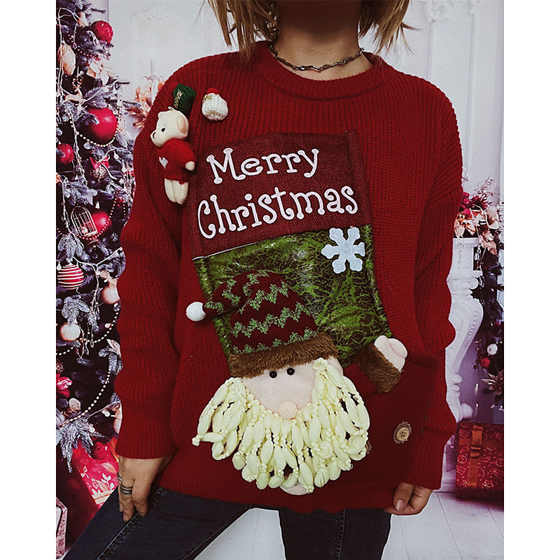 Women's Sweater Pullover Pom Poms Ugly Christmas Gifts Streetwear Letter Santa Claus Crew Neck Knitted Print Long Sleeve Regular Tops Knit Christmas Daily Holiday Red Fall Winter