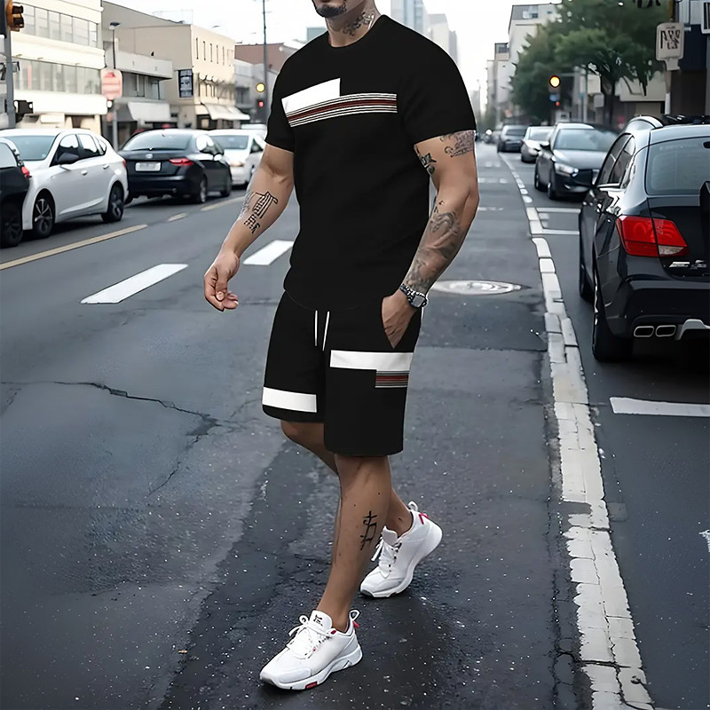 Men's Line 2pcs Tees sets Summer Tops Short Sleeve Short Pants Crew Neck Streetwear Sport Casual Sports Outdoor Casual 3D Print Summer Black Light Green Blue