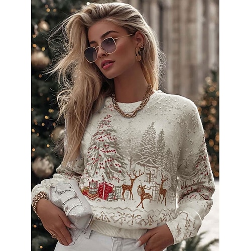 Maglione di moda per donne a tema natalizio grafica casual collo a crew manica lunga regolare tops maglieria lavoro vacanza bianco autunno inverno
