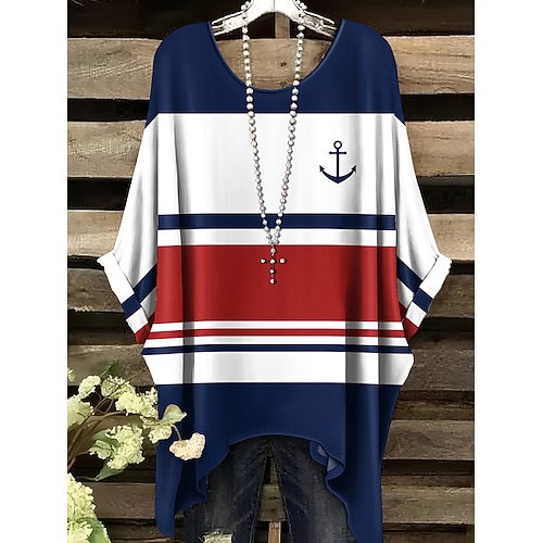 Damen Bluse Grafik Geometrisch Anker Vintage Lässig Kurzarm Fledermaus Ärmel Rundhalsausschnitt Normale Oberteile Täglich Strandbekleidung Urlaubskleidung Farbblock Weiß Rote Sommer Frühling