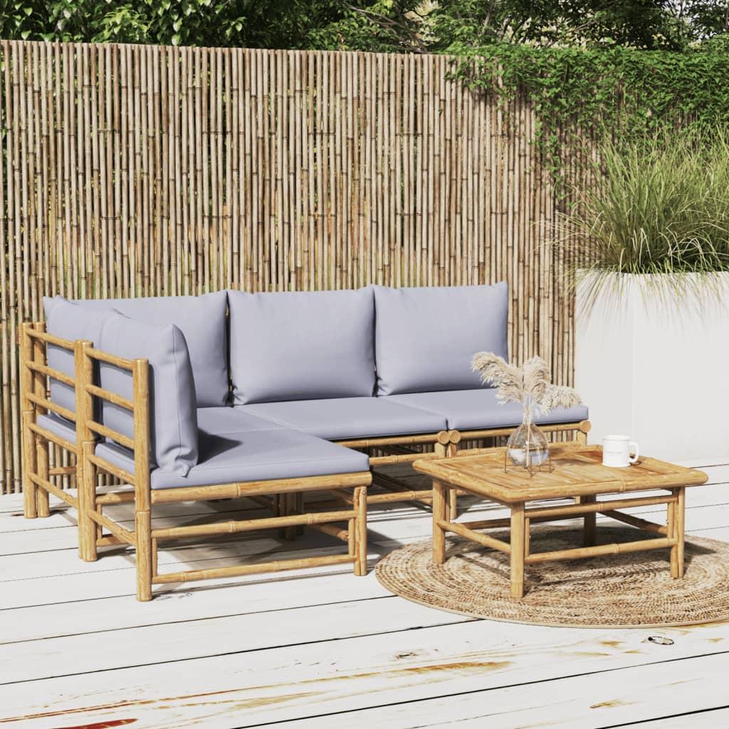 Loungesæt til haven 5 dele med lysegrå hynder bambus