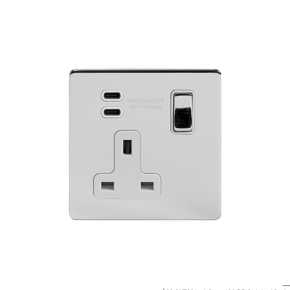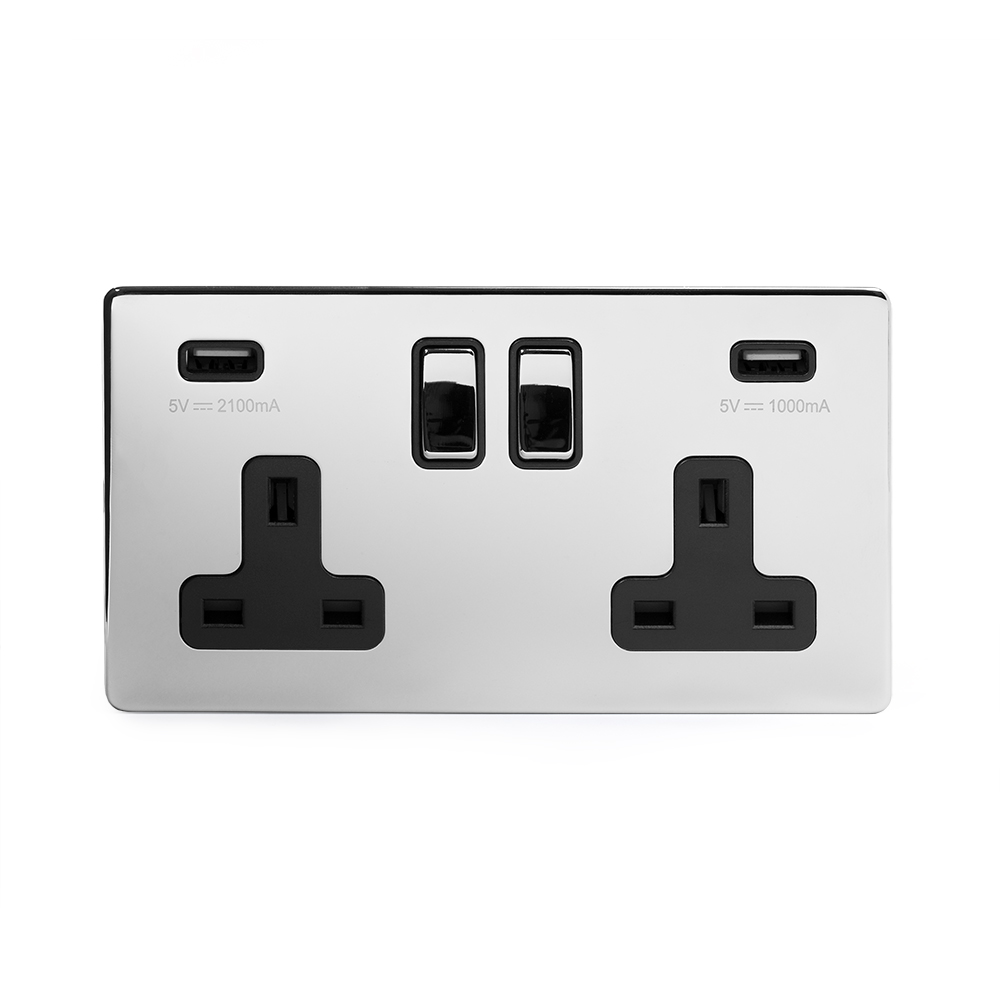 Soho Lighting Polished Chrome 2 Gang 13A SP Socket with 2 x USB-A 3.1A - Size: 86mm x 146mm x 4.5mm